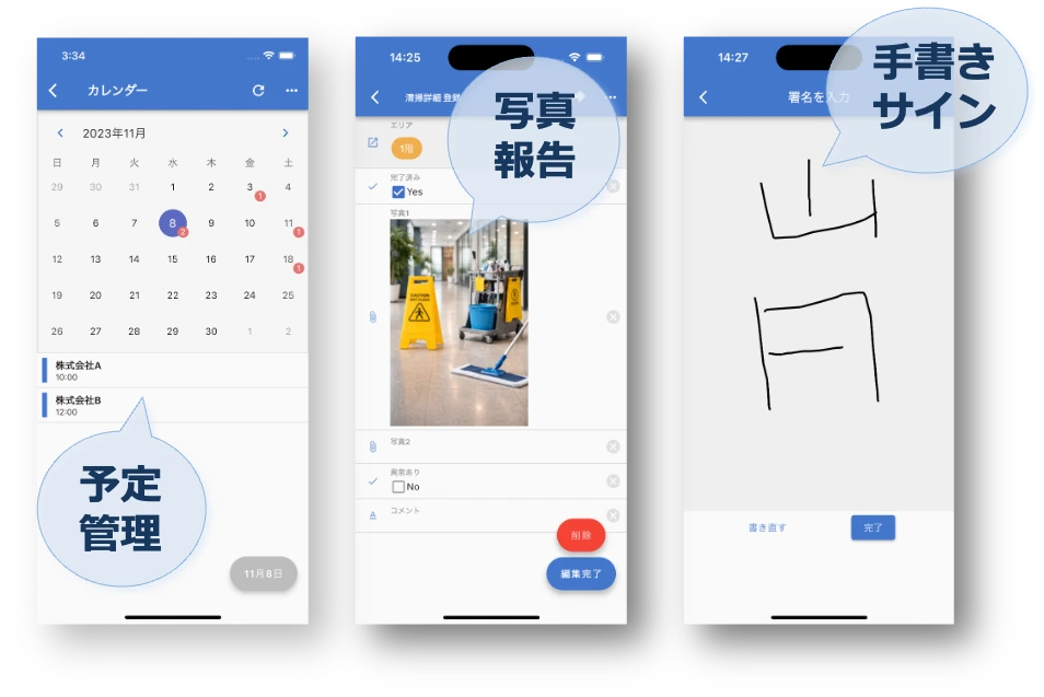 - 顧客の確認サインが必要な場合も、アプリのサイン機能で対応可能