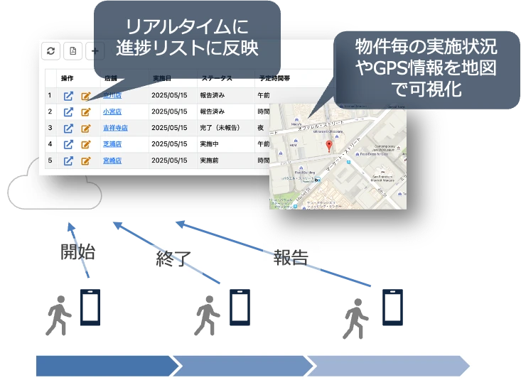 - 最新の位置情報や、物件・店舗毎の実施状況も地図上で把握可能