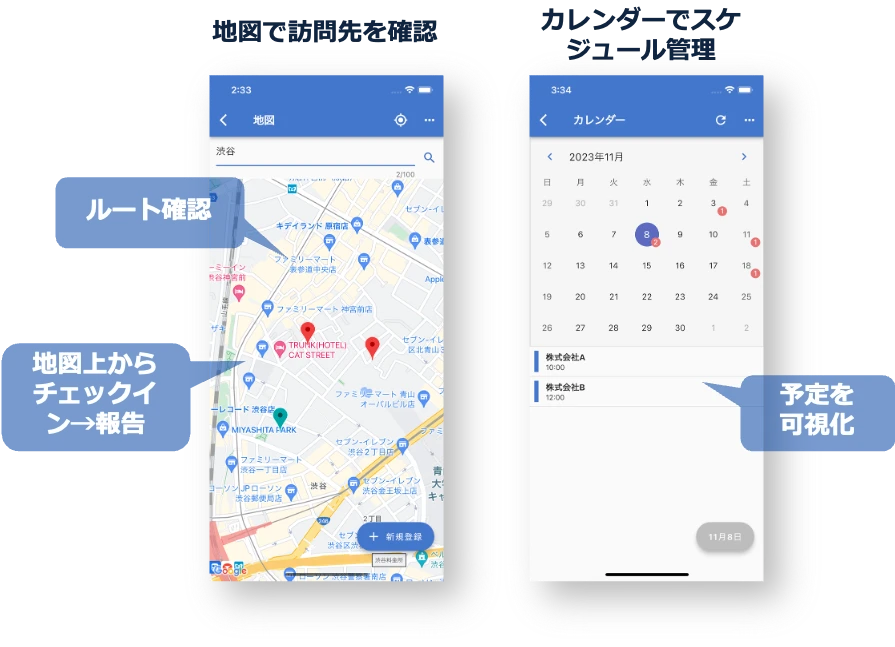- 訪問先を地図上で確認。移動効率を最大化し、迷わない現場を実現。