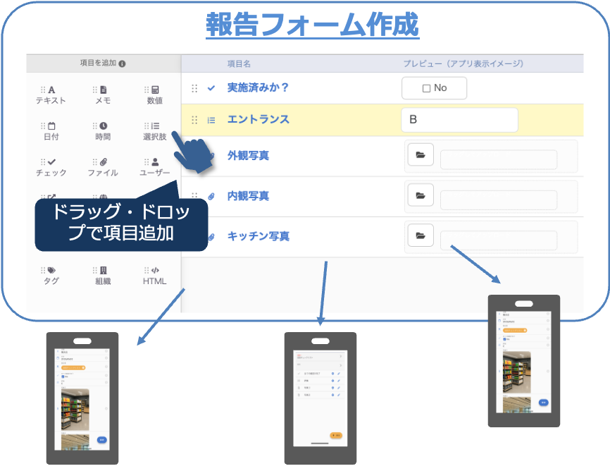 - プログラミング不要。ドラッグ&ドロップ操作で、簡単に報告フォームを作れるので、現場で必要な報告書をすぐに準備できる